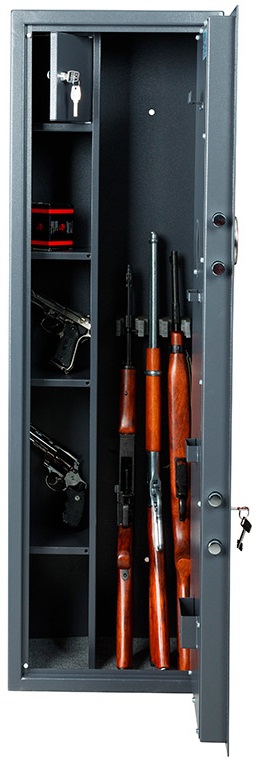 — Сейф делится на две секции: одна оборудована тремя ложементами, во второй расположены съёмные полки и трейзер (запирающееся на ключ отделение для патронов) размерами 222 x 178 x 187 мм.